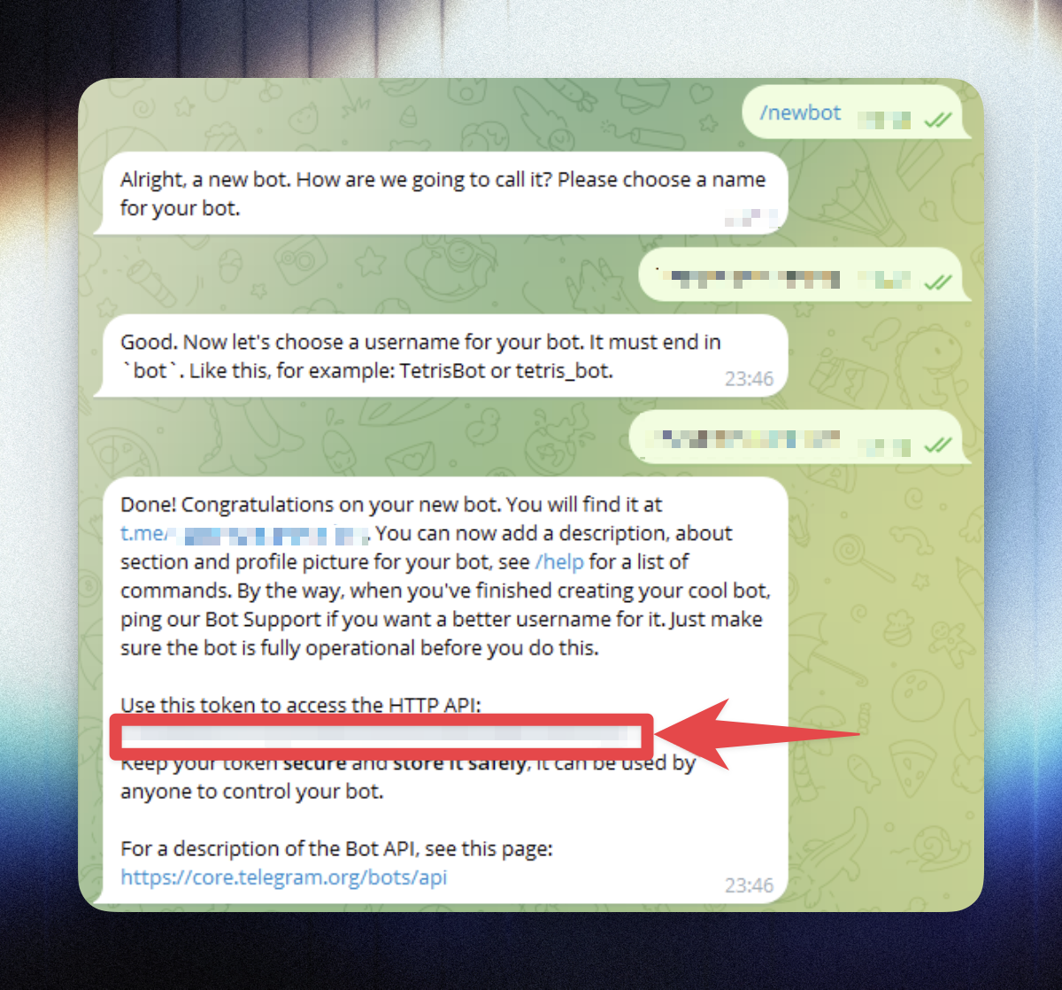 After you finish the setup, BotFather will send you a message that includes your API Token.