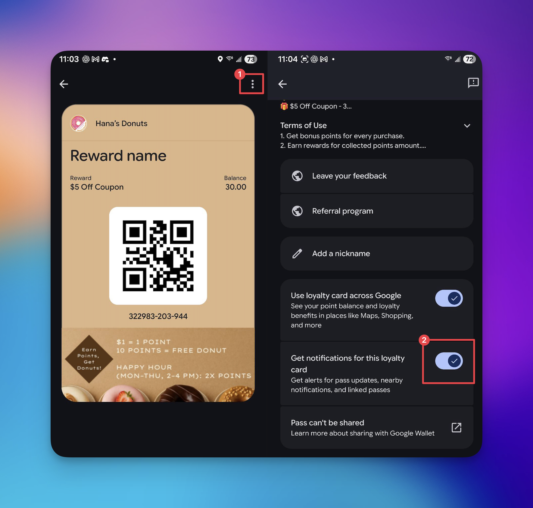 If you didn’t select the "Allow Notifications" option when you first added your card to Google Wallet, you can easily enable them at any time to ensure you never miss a reward or point update.