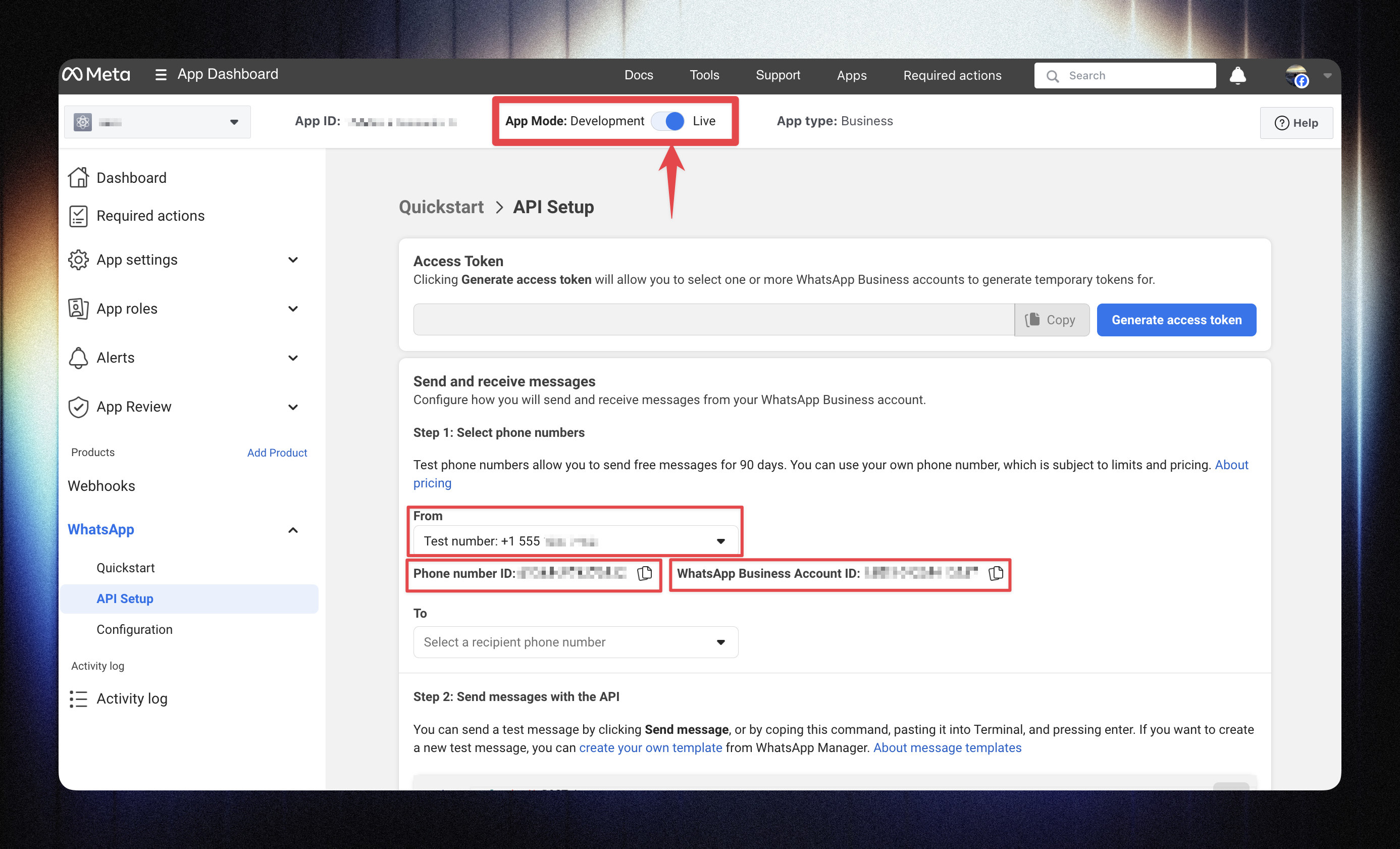 Live mode is required for sending real messages through the API.