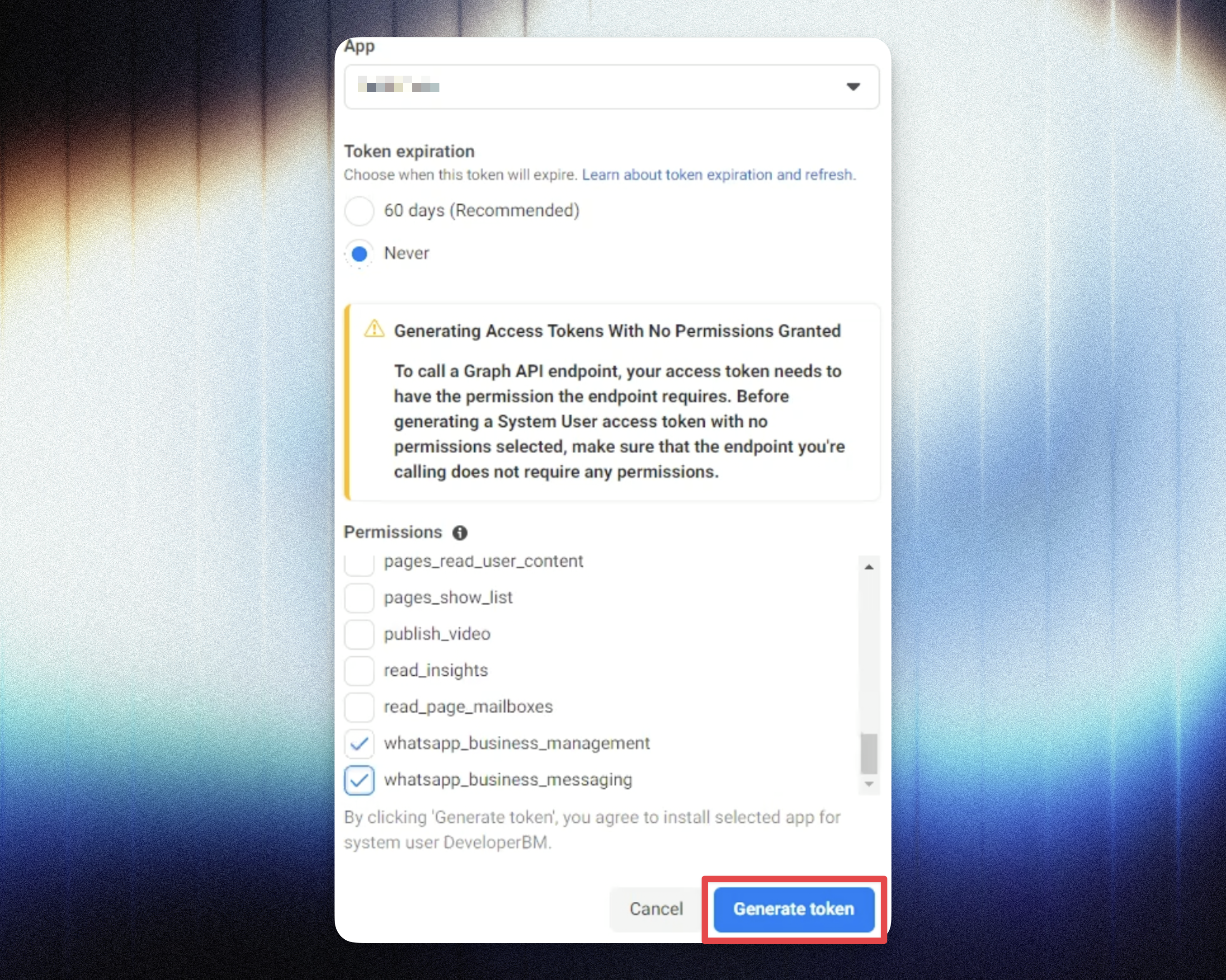 Temporary tokens from Meta expire in 24 hours, so you’ll need a permanent one.