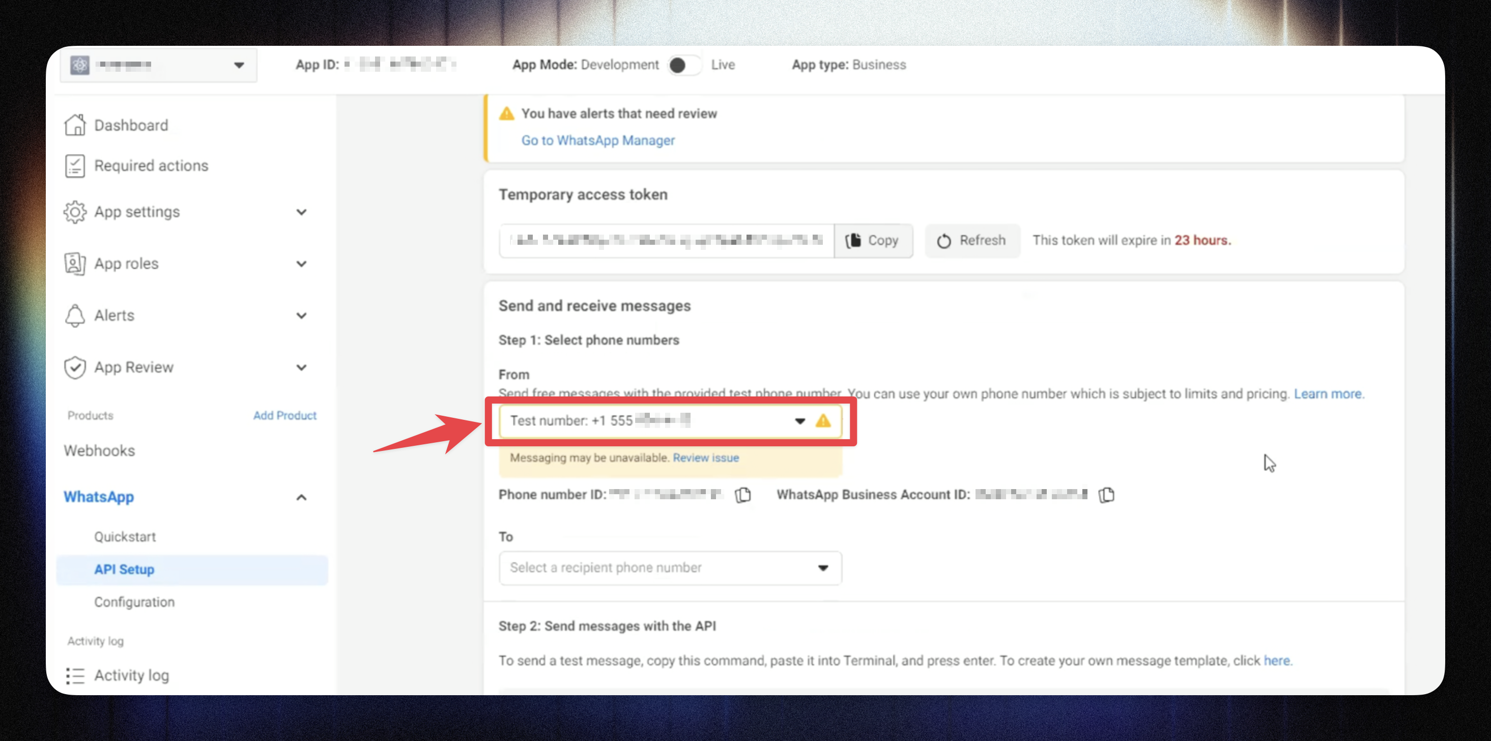 Test message not delivered | Unapproved message template | Get your template approved in the Meta dashboard. |