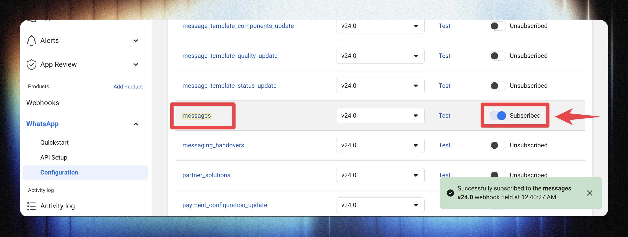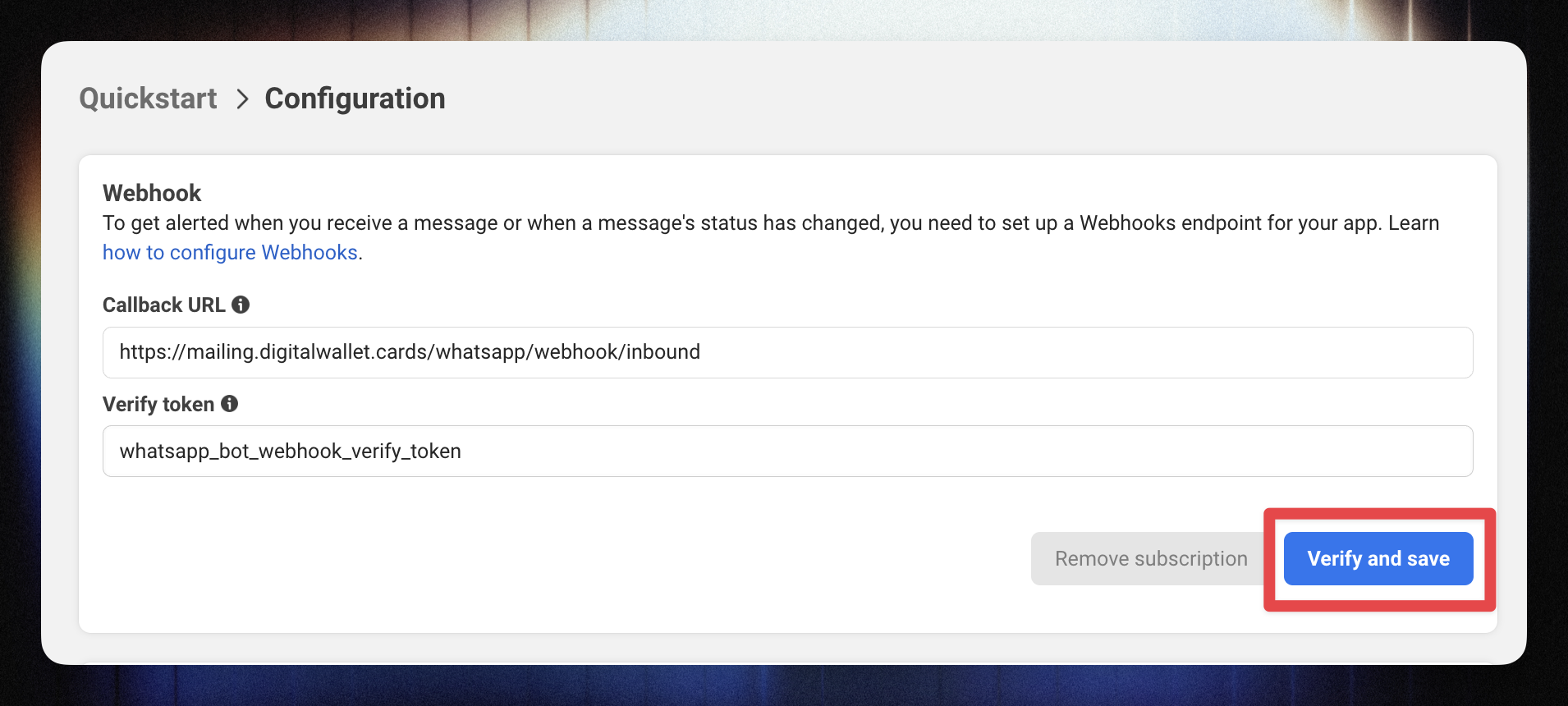 You should see a success message confirming webhook verification.