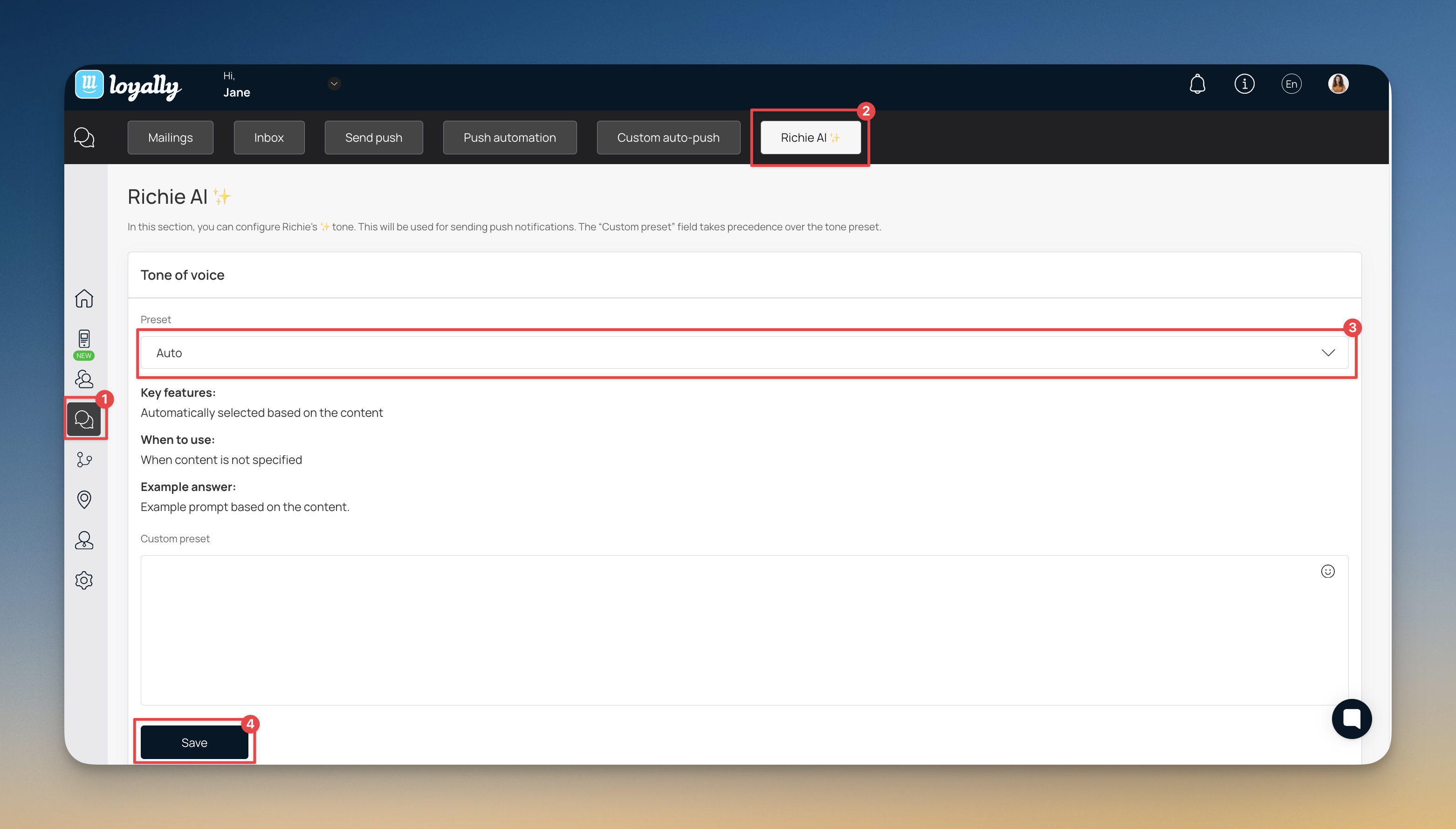 Richie AI provides a variety of presets to match your business goals. Selecting the right option helps you communicate more effectively with your loyalty members: