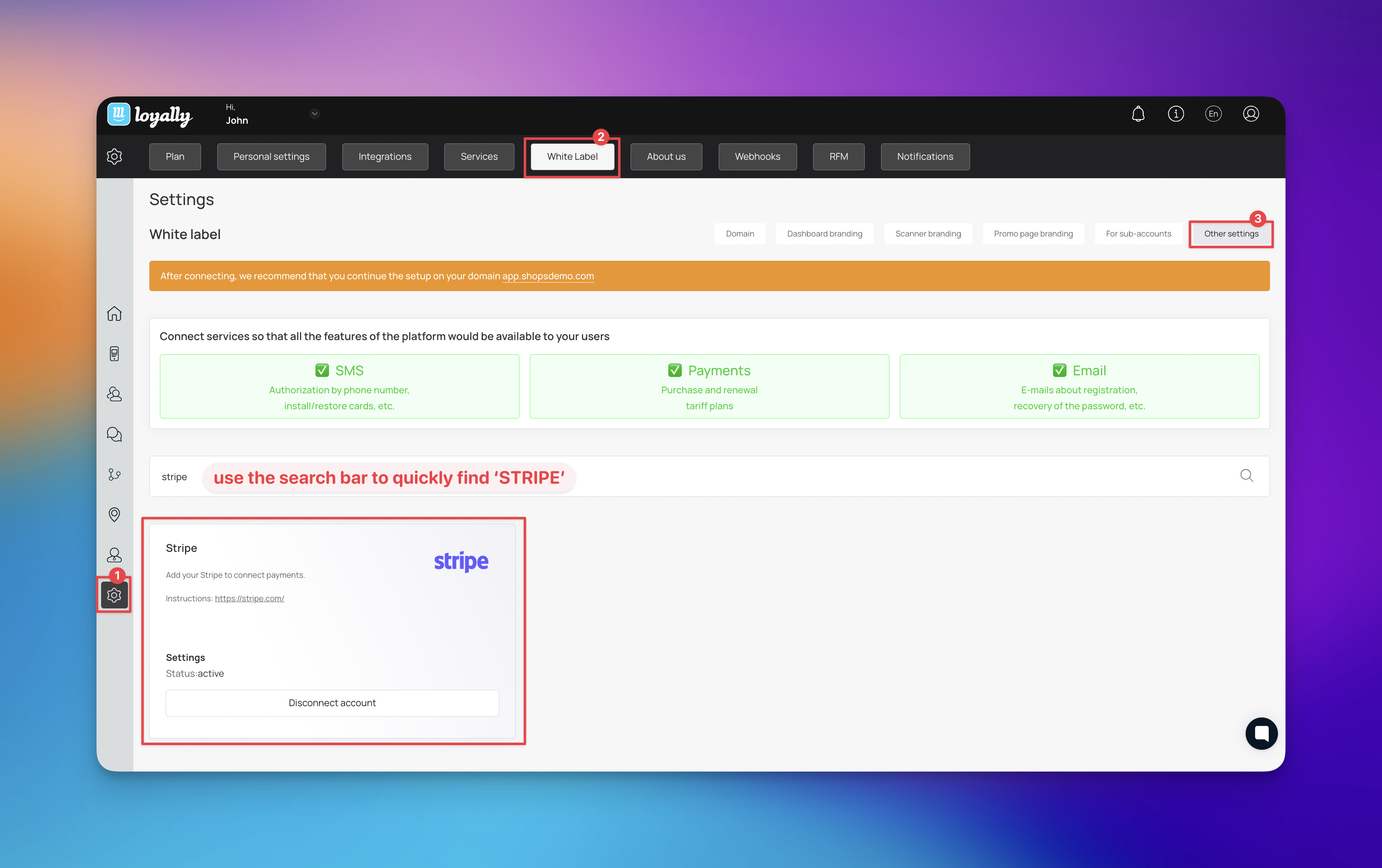 This guide provides step-by-step instructions on how to connect your Stripe account to your Loyalty dashboard. Integrating Stripe allows you to process payments securely and seamlessly within your loyalty program.