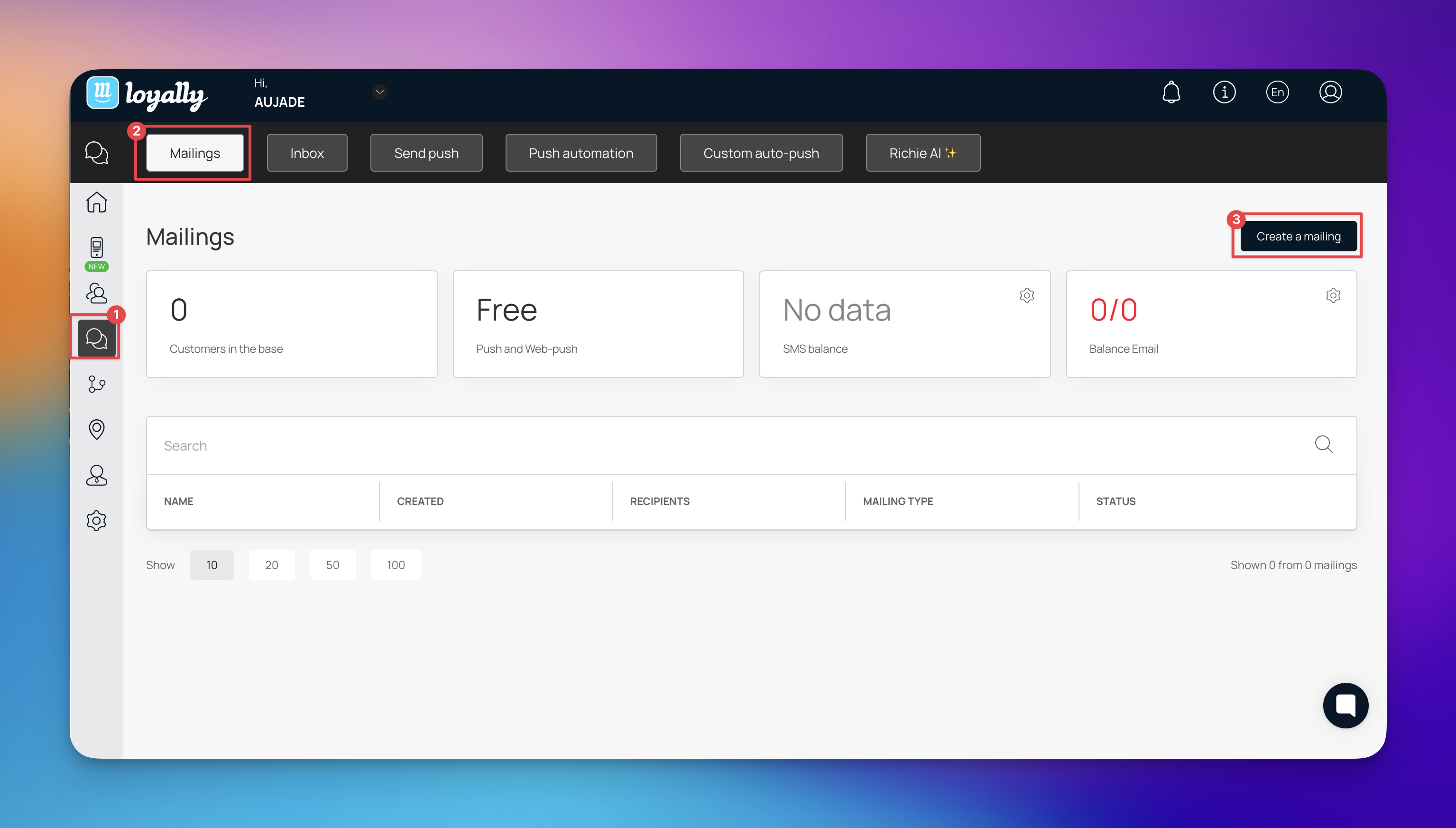 Sign in to Loyally.ai and go to 'Mailings' in the Menu Panel.